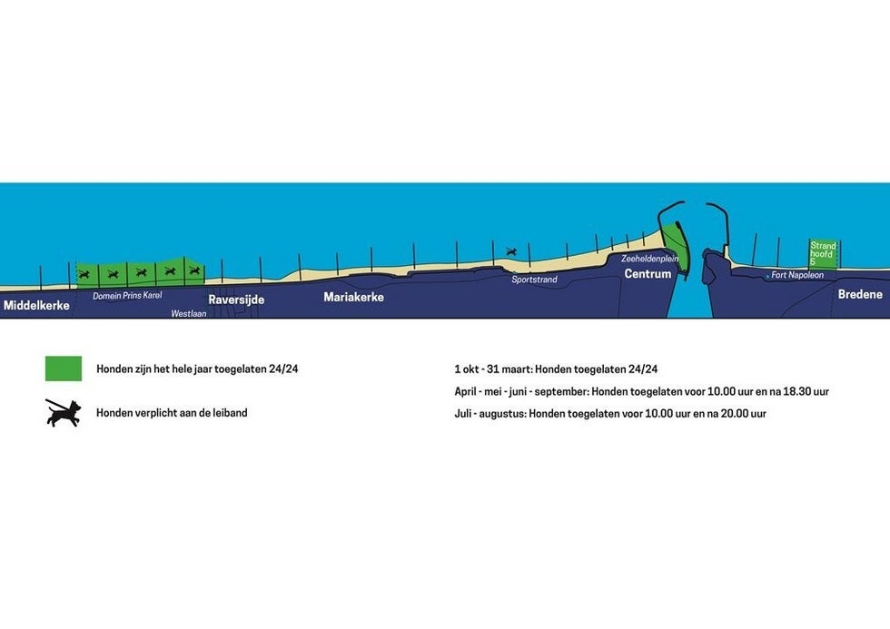 - Op het strand vanaf de Westlaan (Raversijde - straathoofd 15 bis) tot aan de grens met Middelkerke (tussen strandhoofden 19 en 20). Op dit stuk strand moet de hond aan de leiband!